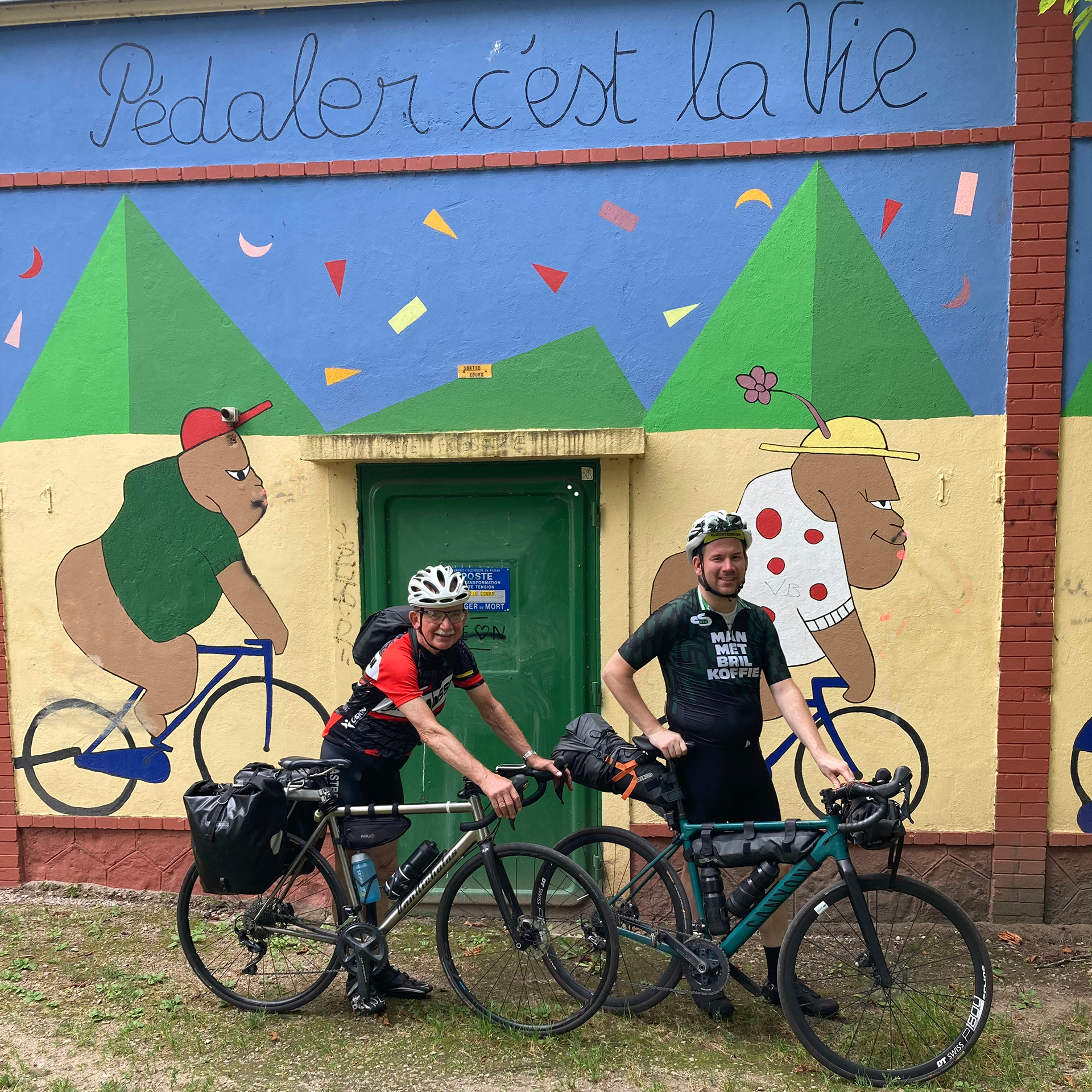 Voor deze vakantie heb ik het logo dat ik in 2019 heb ontworpen voor onze vorige fietsreis aangepast. Dit nieuwe ontwerp heb ik vervolgens laten drukken op koerspetjes van de Decathlon, wat uiteindelijk tot leuke merchandise leidde. Het was een geweldige herinnering aan een bijzondere reis.